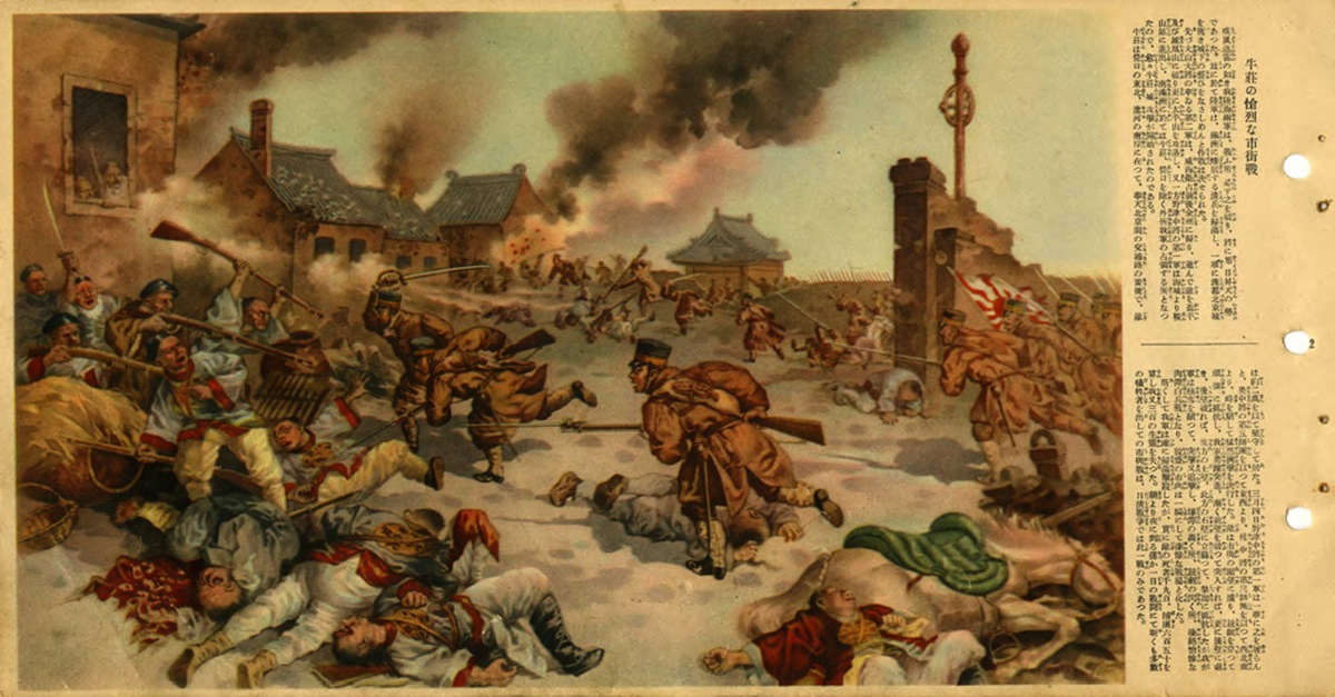 English: Title = "Battle of Yingkou 1895." Print depicts the last land battle of the Sino-Japanese war fought outside the foreign port of Yingkou, Manchura (then known as Niuzhuang).