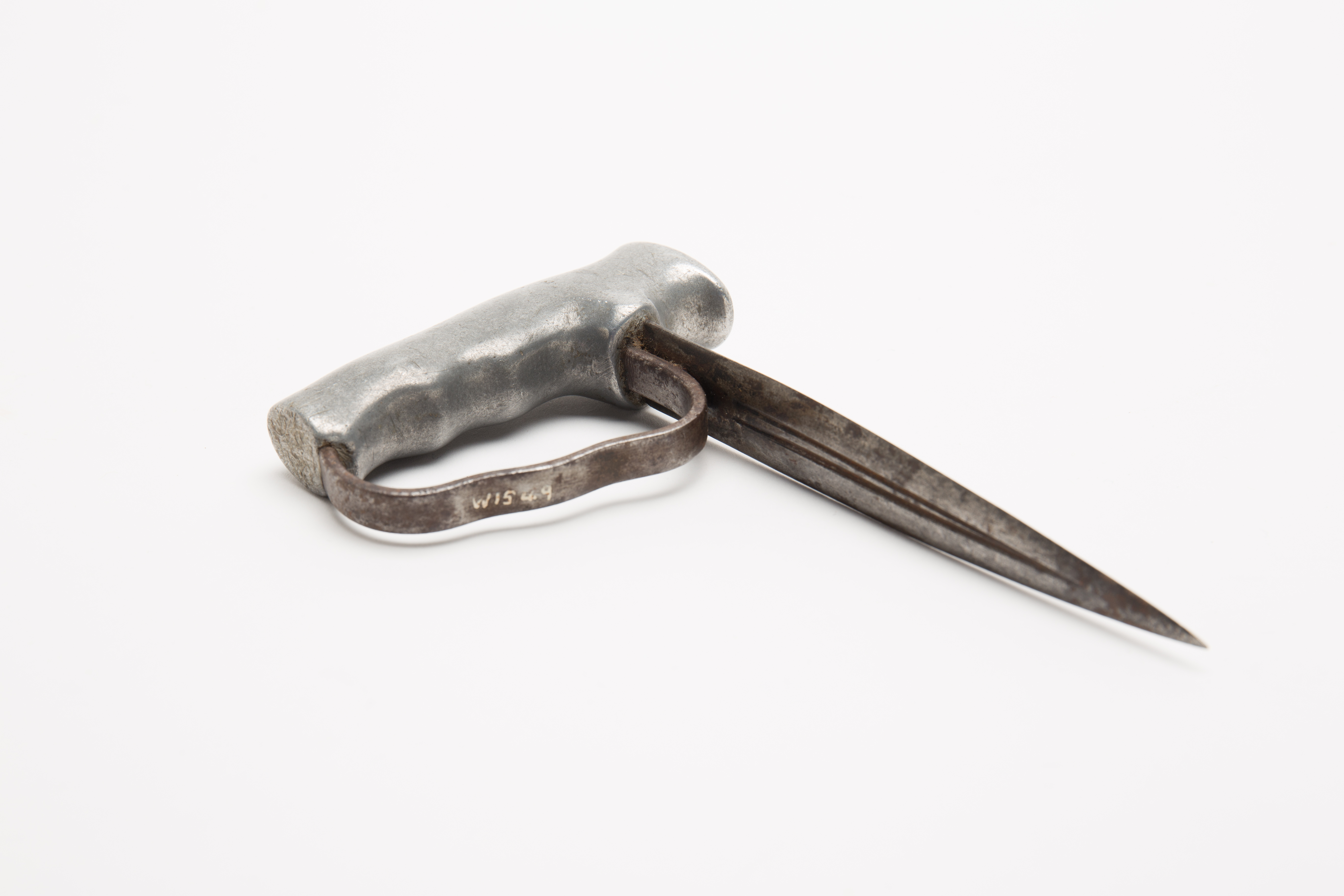 English: Robbins punch dagger, WW1 brief metal alloy grip; steel blade with two fullers; 170mm x 100mm maker- Robbins of Dudley