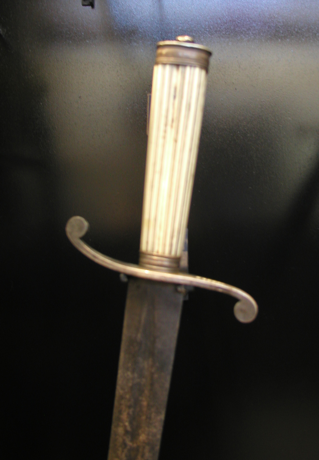 English: Naval Midshipman's Dirk with damaged scabbard, late 18th Century flat single-fullered blade; silver mounted hilt mounts; bone handle grips, quillons; scabbard with black leather, silver fittings and chain;