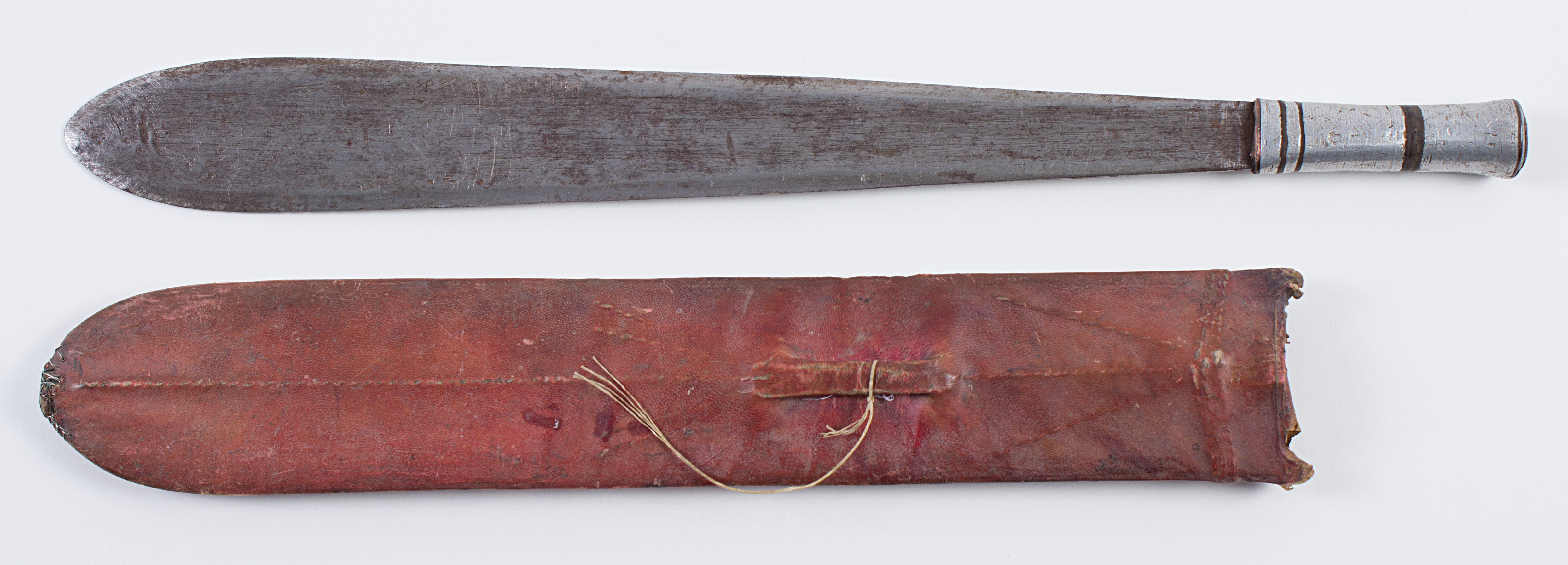 English: Simi machete or long knife with double-edged leaf-shape blade and metal sheathed wooden handle. Scabbard made of leather covered wood panels, stitched together. Weapon associated with Kikuyu Mau Mau leader Njuguna, Kenya, late 1950s. |