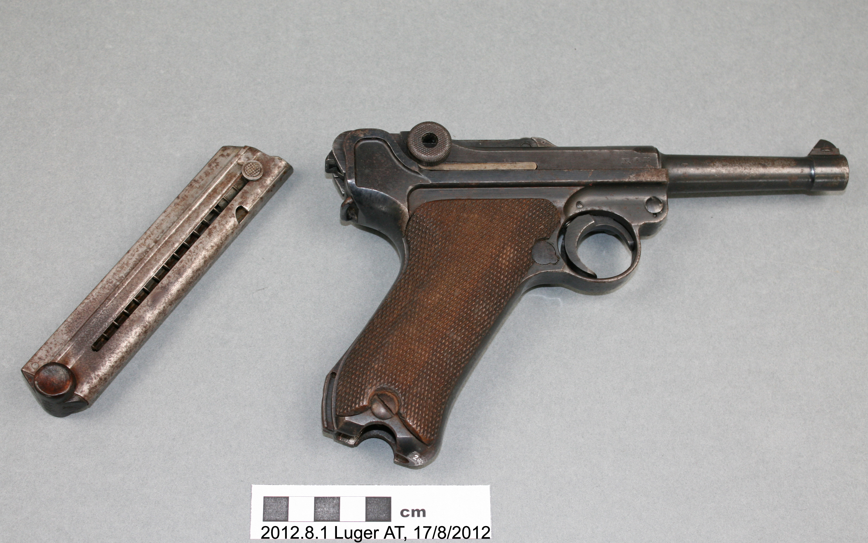 English: German Luger P08 1940 semi-automatic pistol, WW2 Brought back from WW2 by 2nd Lieut. JR McCullough, 21 Infantry Battalion, 2NZEF Luger pistol with magazine; toggle action; standard short barrel; fixed lanyard loop at rear; chequered wooden grips; action at fault magazine- 8-round mismatched, WWI style (wooden endpiece) missing- firing pin and spring markings- on top of body- 1940 on top of toggle action, maker's code- 42 left forward of body and front of body forward of trigger guard- serial number- 5896 various removable parts- 96 under safety catch- GESICHERT magazine numbered- 5209 |