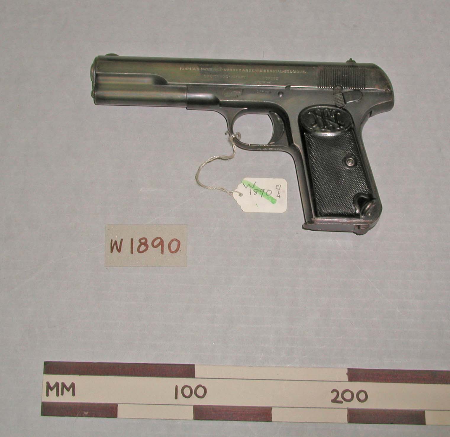 English: Browning Model 1903 semi-automatic pistol Belonged to Major PB Greenhough, Auckland Garrison Artillery, 1914 Brownings Patent semi-automatic pistol; .38 inch calibre; enclosed hammer; with magazine; action frozen markings- Belgian proof and maker's marks on barrel serial number on right hand side of body above trigger- 35879 logo at top of grips- NFC retailer's markings in top of barrel- WM. H. HAZARD. Auckland presentation details engraved on right hand side of slide adjacent to ejector port- MAJOR P.B. GREENHOUGH - AUCKLAND GARRISON ARTILLERY - from HIS BROTHER OFFICERS - 9-11-14 on left hand side of slide- FABRIQUE-NATIONALE-D'ARMES de GUERRE-HERSTAL-BELGIQUE. - BROWNING'S-PATENT DEPOSE maker- Browning unworking - pinned |