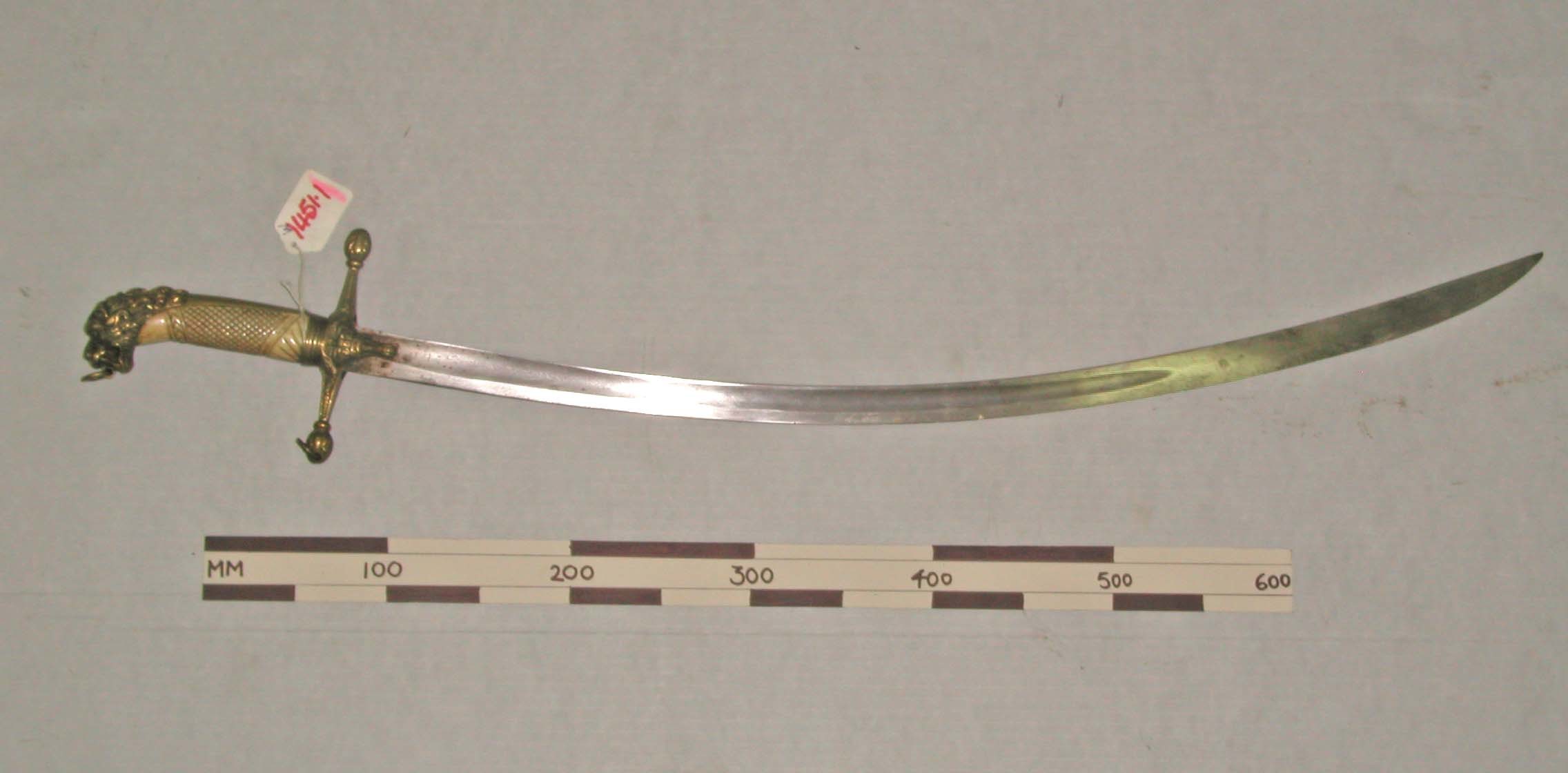 English: sword - curved sword with brass hilt with lion head and ivory grip; brass (gilt) lion's head pommel; quillon with St Edward's crown; rings attached to quillon and to lion's head for hanging chain missing parts- scabbard, hanging chain
