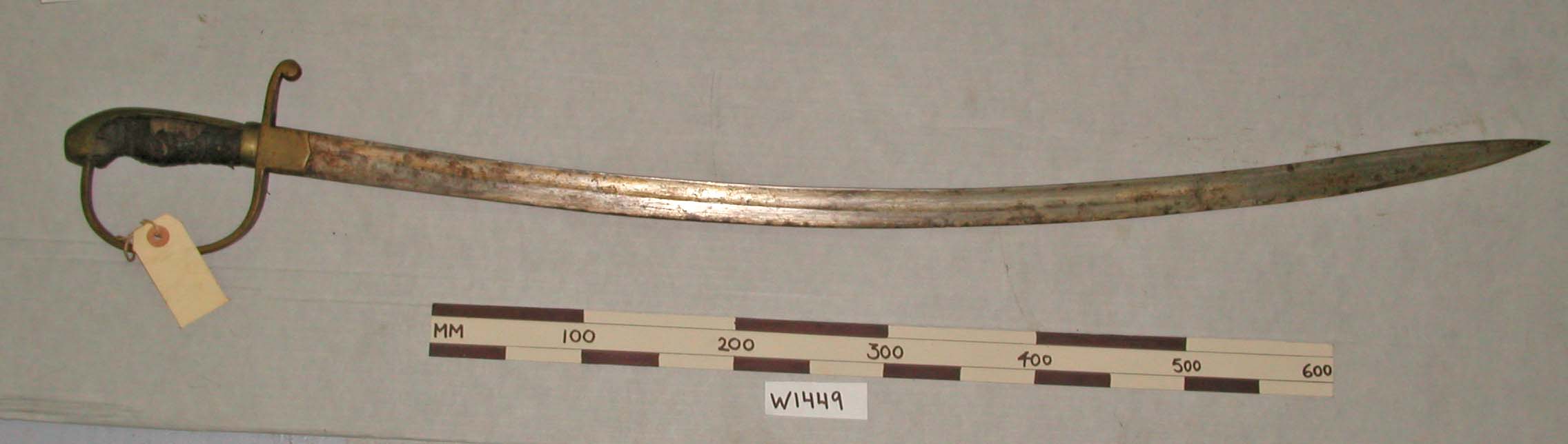 English: Cavalry (.) sword or sabre blade- sabre type metal blade; fuller 22 1-2 inches long hilt- brass grip- wood bound with black leather (disintegrating) measurements- blade length- 33 1-2 inches; overall length- 39 1-2 inches markings- nil