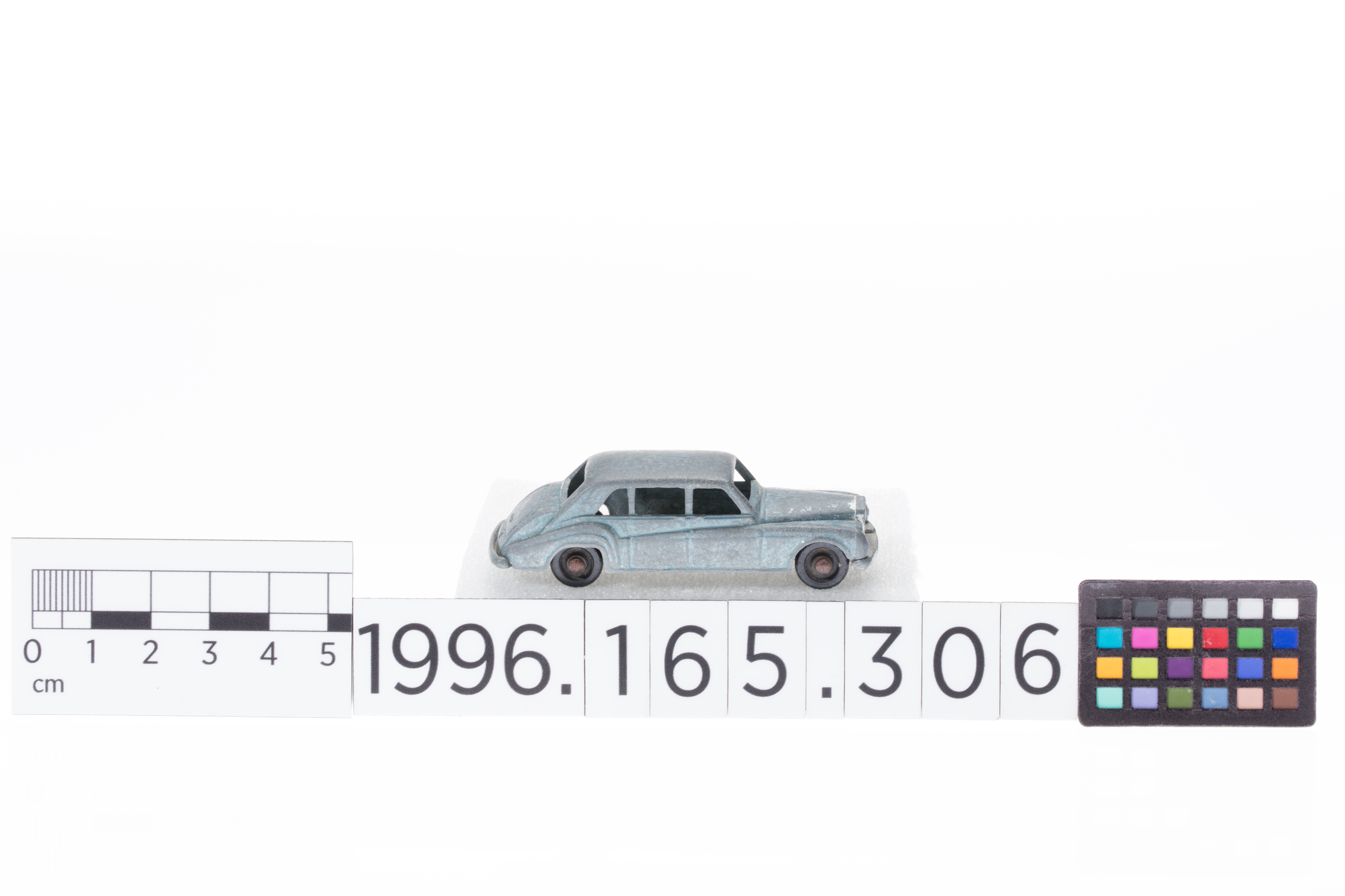English: Rolls Royce Phantom V diecast zinc toy car, blue with black plastic wheels, marked "ROLLS ROYCE - PHANTOM V - MADE IN NEW ZEALAND NO 23 - FUN HO! N.Z."