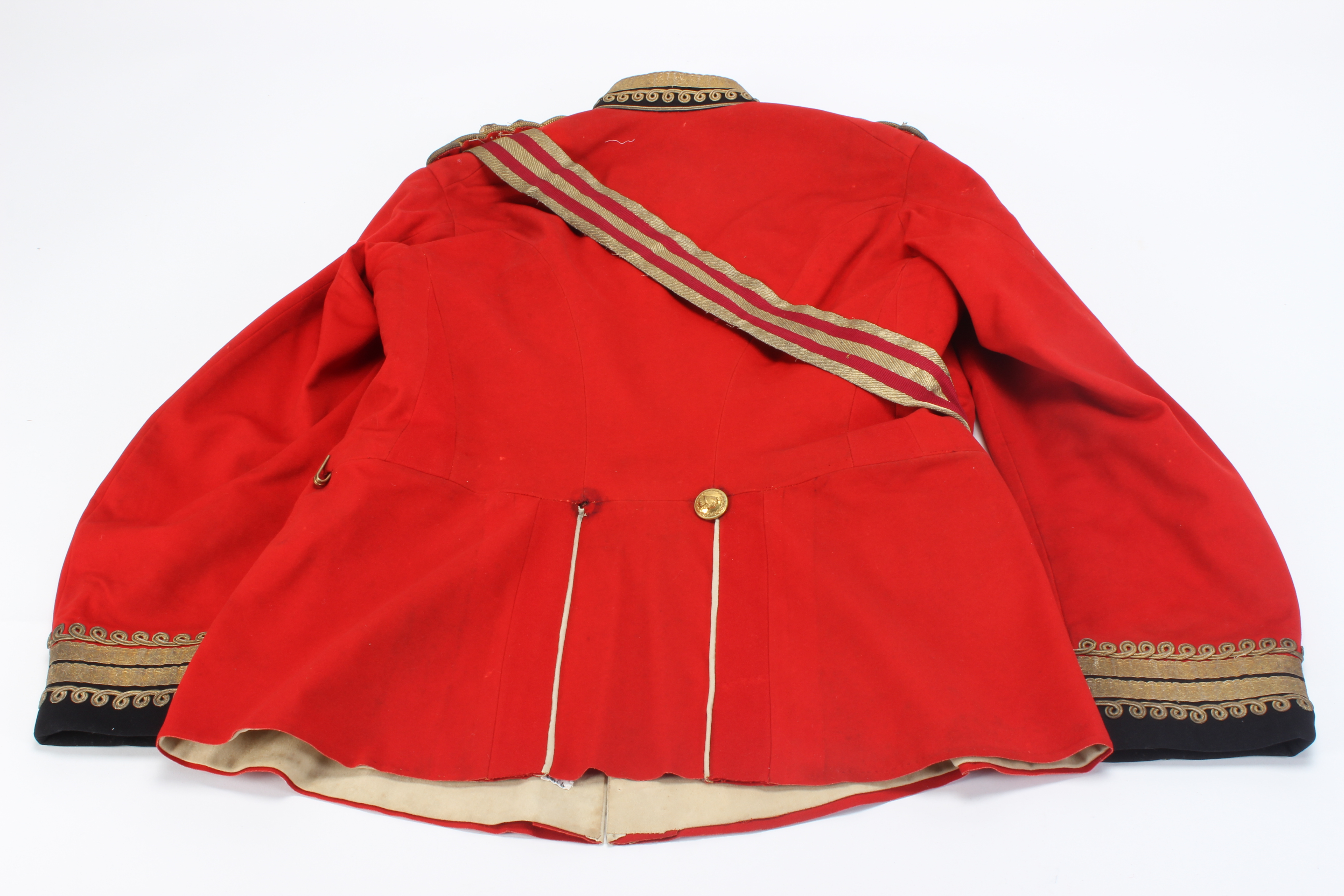 English: Tunic - 18th Royal Irish Regiment, post-New Zealand Wars period Belonged to Lieutenant Colonel Charlton Dawson red tunic with gold braid and lace; collar has gold lace edge and braid inset buttons- crowned harps with inside laurel wreath sash- full-dress uniform sash |