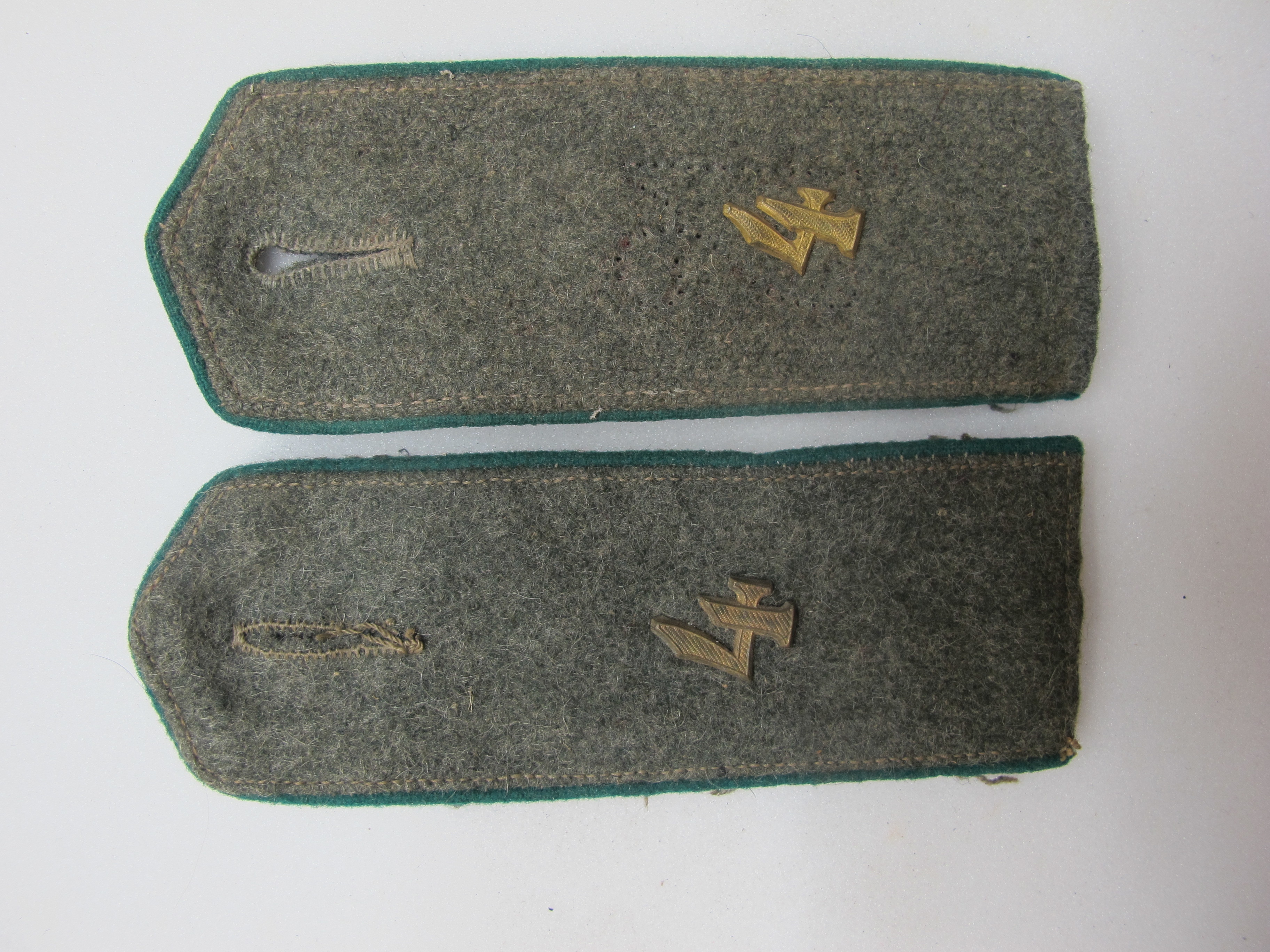 English: German army other ranks shoulder strap- 4 Infantry Regiment, WW1 field grey shoulder strap; forest green piping; brass numeral 4; machine-stitched button-hole