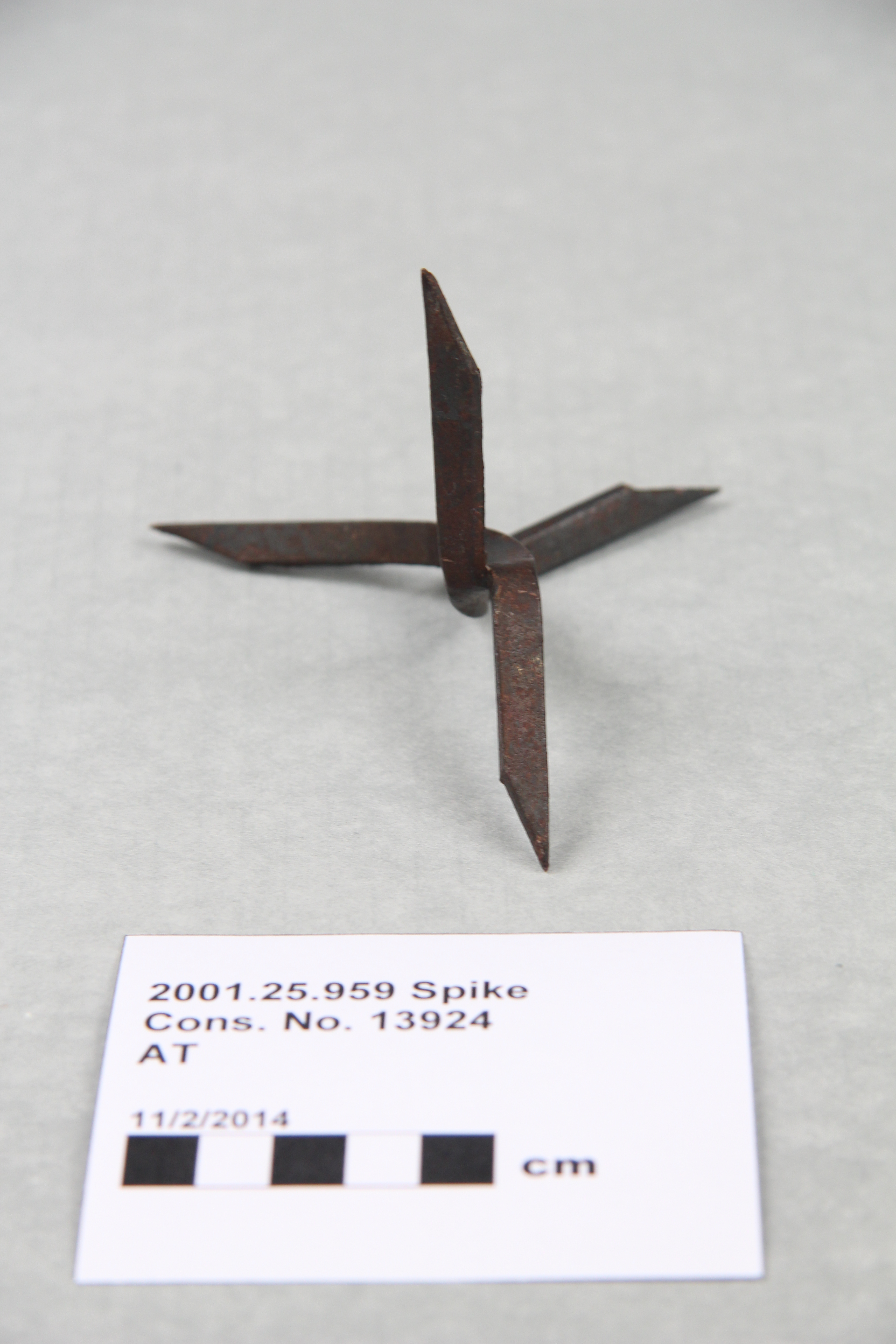 English: Spike used to cripple horses, collected by Staff Nurse Ethel M Strachan while nursing in Russia during WW1 twisted one piece steel anti-personell spike; (used to cripple horses) |