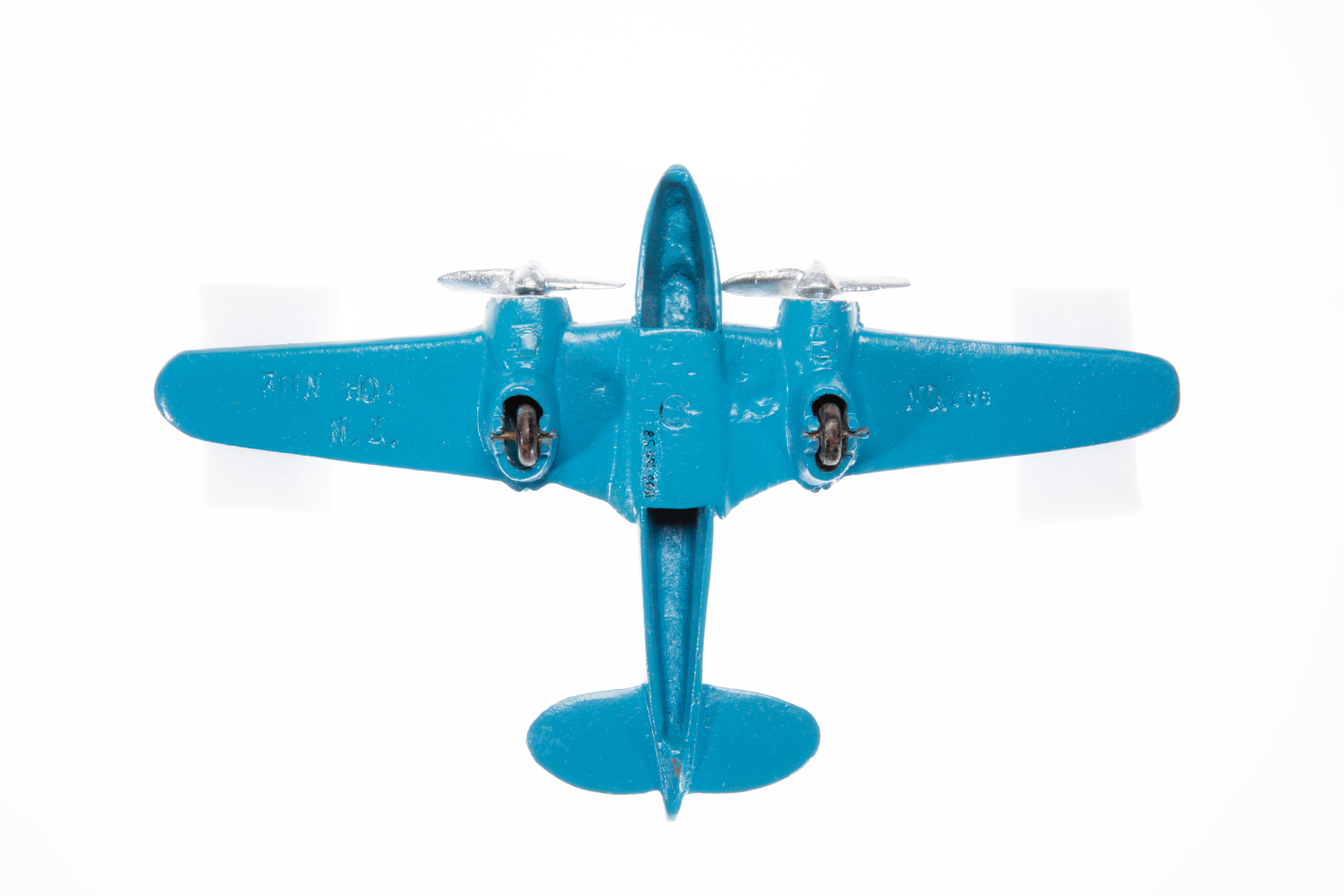 English: RAF bomber, blue cast aluminium toy plane with tin plate wheels, plane is blue with silver propeller blades and window, black wheels. Cast "FUN HO!. NZ" - "NO.106" on underside of wings.